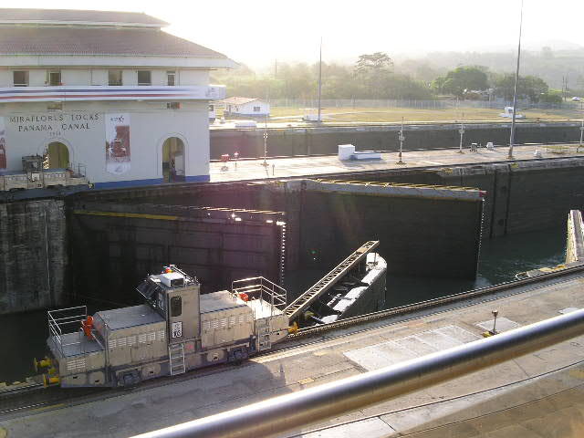 Diary/Photo Journal Week of February 08, 2004 (for Central America only - see South America Diary Index for last half of week) Well, we did it! We not only got Cindy shipped out on the evening on February 9th, we caught our flight out the next day to Quito, Ecuador with no problems. Ahhh, but I am ahead of myself. Quito's experience is to be found by referencing the South America Diary Index and I have yet to finish our exhilarating last day in Panama City. We spent our last day in Panama City, tying up loose ends and fretting over whether Cindy would get seaborne. We had Walter, our very patient shipping agent, acquire the departure information and to our devastating chagrin, Cindy would go through the locks of the Panama Canal in the following schedule: Gatun around 5:00 p.m., Pedro Miguel around 11:00p.m. - midnight., and Miraflores around 1:15 - 2:00 a.m. We were so hoping to catch a glimpse of Cindy and wave to her as she passed through the locks, but for a reactive moment, it appeared it was not to be. We were two hours away from Gatun and it was 3:00 p.m. when we got the news. Miraflores' observation center closes down at 5:00 p.m. and the restaurant closes at 11:00 p.m. Gatun was definitely out. Pedro Miguel is in the middle of nowhere, has no observation area, but through a 10' high fence, you can watch the ships pass into the canal from 100 yards away. Miraflores? Well, we went to the observation center just before it closed and tried to sweet talk the restaurant into allowing us to remain behind while the employees clean and close; however, in all of Latin America, it just so happens that this blasted restaurant has to be the only business that is efficient and cleans and closes within a half hour of its last customer, meaning around midnight.