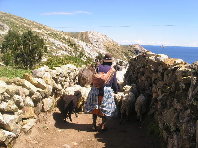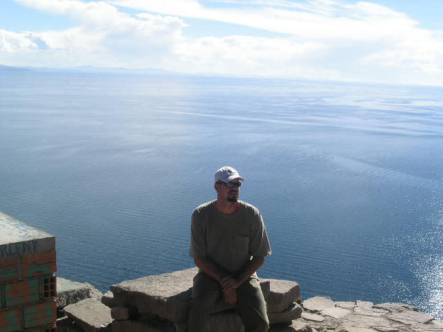 Lake Titicaca has long been considered a sacred place among indigenous Andean peoples. According to Andean legend, Lake Titicaca was the birthplace of civilization. Viracocha, the creator deity, lightened a dark world by having the sun, moon and stars rise from the lake and occupy their places in the sky. The people who live in and around the lake consider themselves descendents of Mama Qota (Sacred Mother), and they believe that powerful spirits live in the lake's depths. Lake Titicaca has been inhabited since before 2500 B.C. and the totora reed boats were used even then. Many of the inhabitants of the lake itself live on what are called "floating islands" and are referred to as the Uros Indians. The floating islands are made by hand from totora reeds that abundantly grow in the shallows of Lake Titicaca. This unique construction technique has been practiced since before the Incas and today, there are approximately 30 floating islands. The islands have schools, a post office, churches etc. as well as the communal homes for the families of the 1000 or so inhabitants. The islands and most of the buildings constructed on top of the islands are all built out of the totora reeds. They maintain the islands by placing new reeds on the top layer of the island, all the while the bottom "layers" are rotting away. The island's base/floor is anywhere from 3-6 meters thick (9-18 feet) and when walked upon, has a somewhat "springy" sensation as though you are walking on a firm mattress. Our visit to three islands was sensational. Even though the islands resemble floating souvenir stands, there is something to be said about walking on a floating mass that is built completely of reeds. We also took the opportunity to ride from one island to another in the totora reed boat and what a pleasant ride that was. All in all, to see these famed islands and to actually walk upon the reed mat (and not fall through) was quite exciting for us. We left Peru with bittersweet emotions. Bitter because we really enjoyed Peru and sweet, because we were looking forward to Bolivia. Fortunately, our border crossing was very easy and we landed in Copacabana, Bolivia, which is on another shore of Lake Titicaca. We jumped at the first opportunity to take the two hour boat ride to Isla del Sol. There are two important islands in Lake Titicaca, Isla del Sol and Isla de la Luna. Isla del Sol is considered the creation site of the Inca peoples. It was on this island that the bearded god Viracocha and the first Incas, Manco Capac and his sister-wife Mama Huaca, made their mystical appearances. Isla del Sol today continues to be reverred as sacred to the Aymara and to the Quechua Indians.