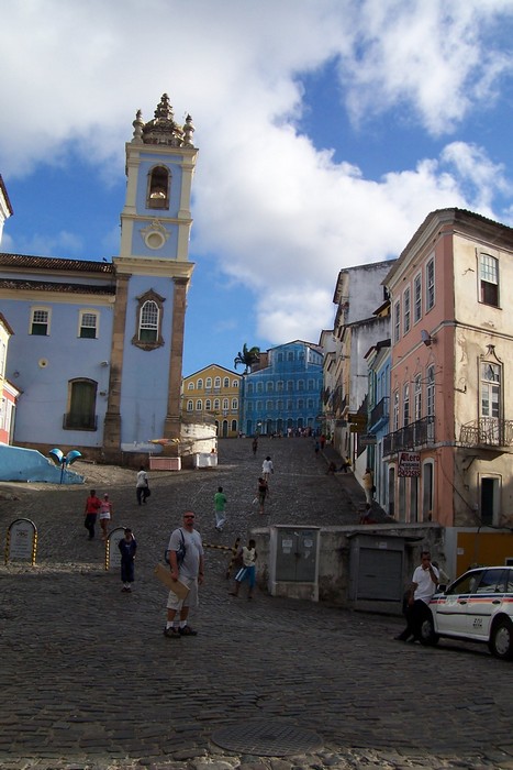 For as long as I have known Gerson (it seems like ages!) he has talked about taking me to the State of Bahia and more specifically, around the city of Salvador. After reading several travel books and other similar literature, I knew I would see beautiful beaches, turquoise waters, diverse peoples, etc. and so I thought I knew what to expect. Was I wrong! The plane had not even landed yet and I was stunned by the magnificent beauty displayed in this part of Brasil. Upon flying into Salvador, you feel as though it is mandatory that all things move a tad slower. The airplane seemingly slows down in mid-flight, your mind starts to organize its thoughts with great pauses, your eyes linger on the colorful objects around you and you just become hypnotized by the slow, steady pulsating mood of the place. Even the flight into Salvador had my forehead connected to the inner window of the airplane as I watched atoll after island pass underneath and I found myself counting the sunfish that were doing what they are named for, sunning while lying on their sides. It looked like someone had scattered dozens of pieces of mirrors on the ocean's surface. We hit the ground running, or should I say, driving, as we had rented a car and quickly made our way north toward Praia do Forte (Fort Beach). Not ones to pass up the opportunity to cool off at a small barraca (an intimate beachside bar/restaurant) we found one still serving carangueijo (they are at the very end of their season, hence the rather small versions). We spent a quiet afternoon sipping cold beer and breaking through crab shells. But alas, the time came when we had to push further north and look for a pousada (rather cozy hotels) to rest for the evening. We found what we were looking for in Itacimirim (E-tah-cee-mir-em) and enjoyed the refreshing pool and deserted beaches. Also, we got to see first hand the work of a local organization called the Tamar Project that have been responsible for the protection and reintroduction of several species of sea turtles. Once hunted for their gorgeous shells and their high-protein meat as well as their eggs being collected for easy food, the sea turtles that would migrate every year to these beaches were quickly being eradicated. A turtle-friendly couple saw the devastation of these reptiles that have remained relatively unchanged since dinosaurs stomped over the earth and they started a grass roots program to save the turtles. The very same people that would hunt the turtles and collect their eggs are now paid to identify turtle nests, set up protection around the site and to report turtle happenings to the foundation. The conservation has been so successful, that over one million turtles have been released into the oceans and several of the species are off the endangered lists. One close look at these incredible reptiles makes you realize how much could have been lost had two people not taken the time nor made the effort to save these descendents of dinosaurs. We spent part of our day walking the beaches and teasing the crabs that scuttle to and fro across the sand. The other part we wandered further up the coast to Praia do Forte wherein a wonderful little beatnik/tourist town lies and where the Tamar Project is located. We took the time to be in awe at the turtles as well as venture all around town. From walking the beautiful beaches to watching the fishermen make nets to enjoying a pleasant meal surrounded by tropical plants unlike anything I have ever seen, we loved Praia do Forte. As the name of the town suggests, there was a fort somewhere and we found it. Not so much of a fort as it was home to the first "governor" of the area, Garcia D'Avila. Inasmuch as it was his home, it was built like a fortress with its thick stone walls, many arches, numerous catwalks with sweeping views of the ocean and the nearby river. Built in 1552, this first great building in Brasil has lost its organic roof but still retains its incredible main structure. After Praia do Forte, it was back to Salvador for a couple of days of sightseeing in the first capital city of Brasil (which had maintained that distinction since 1550 to the mid-1800's). A city built on slavery, it is considered the "African soul" of Brasil. While maintaining their cultural roots, the African slaves and their descendents have integrated their culinary, religious, musical, dance and martial arts into the Brazilian culture as a whole. We found a hotel that was a bit beyond what we wanted to spend; however, for around $80 a night, we got breakfast, parking, use of the bar/restaurant dock on the bay (which included a water slide and diving platform), and what else...oh yeah, a 13th story view of the bay along with a Gondola that ferries you up and down the steep cliff to the water! Needless to say, Gerson was in the water before the waiter could bring me our beer (I say "our" beer because they serve the beers in liter bottles and we share to always ensure we drink it before it gets warm). We tooled around in our rented car avoiding the crazy drivers that are loose everywhere in Brasil. We noticed a quaint little church built on a cliff and went in for a quick look. We were pleased to see a beautifully restored ceiling fresco. We moved on down hill and visited the Forte de Santo Antonio de Barra (yes, another fort) that is built around a magnificent lighthouse. We gave over the car to the watchful young man that does nothing but assure you that if you pay him a couple of reais, he will not damage your car or let anyone else. This is a very common practice all over Brasil - paying someone to watch your car (usually where parking is free and on the street) and they provide a weak guarantee that you car will not be broken into or otherwise molested. You might roll your eyes, but in some parts of Brasil, it is a dollar well spent. We walked along the bay, admiring some of the colonial architecture and watching the people. We landed upon one of our intended des